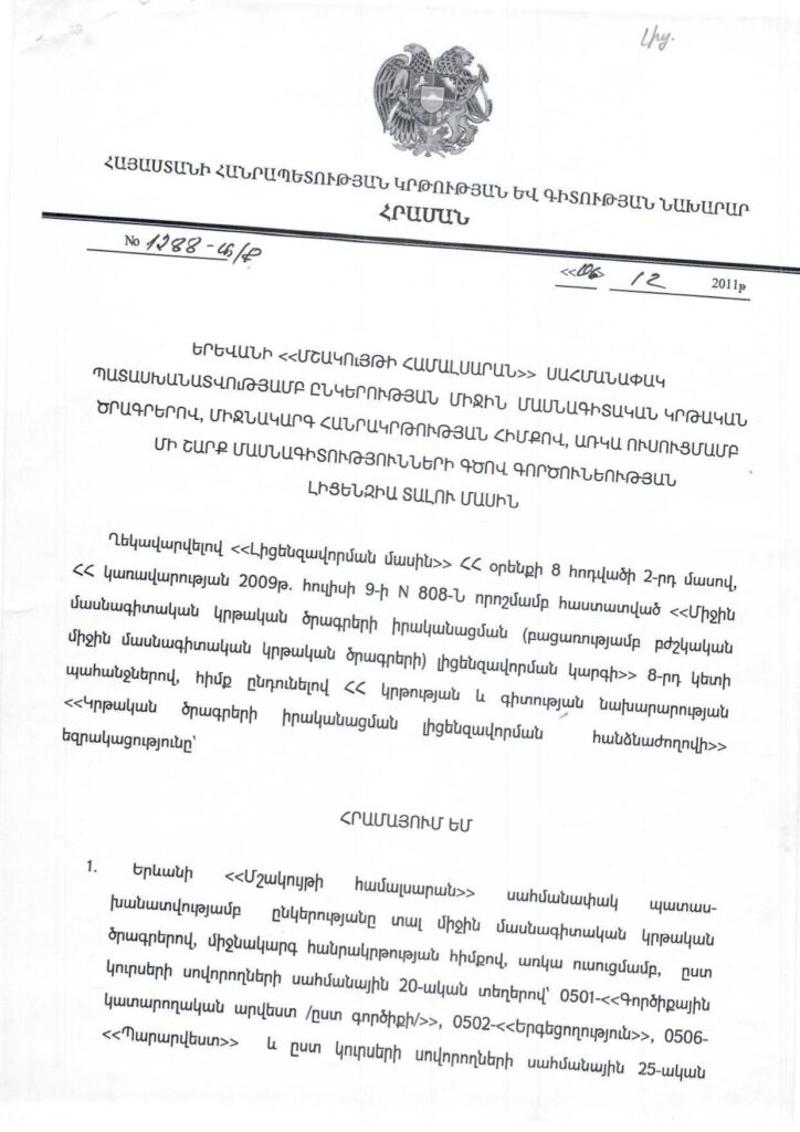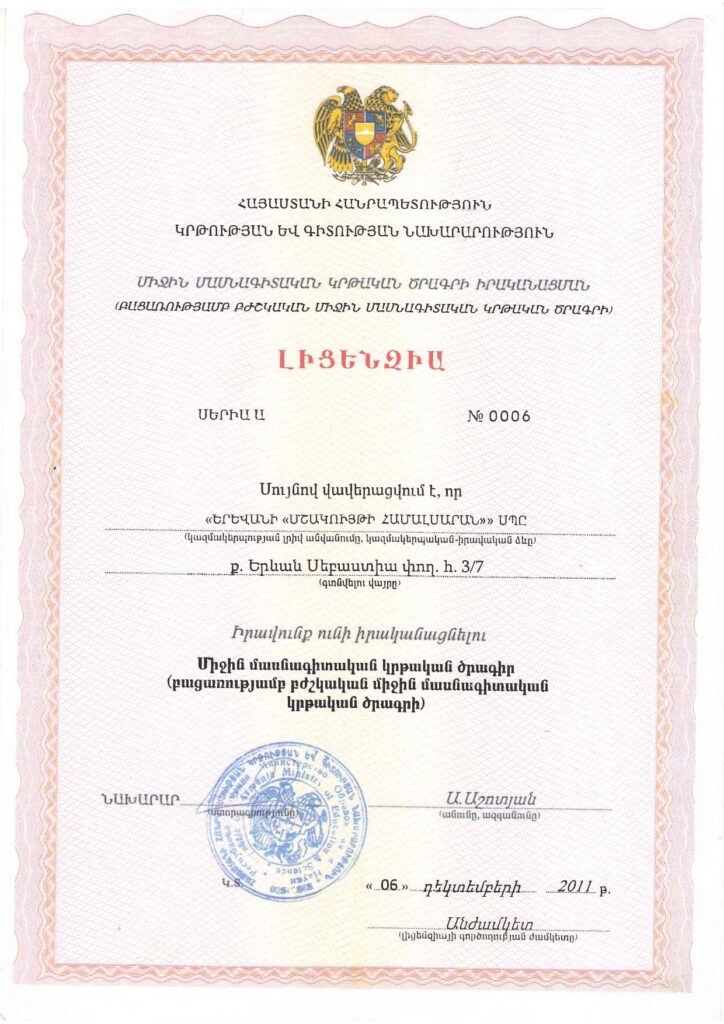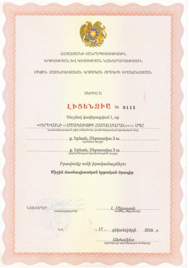 - Ապահովել բարձրորակ մասնագիտական կրթություն մշակույթի տարբեր ոլորտներում,